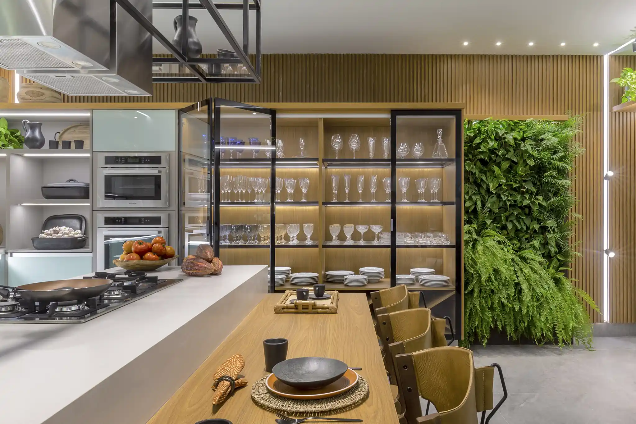 O conceito do ambiente da arquiteta Rubiana Teixeira pode ser sintetizado pela expressão “das origens à modernidade”. Em seu projeto, a profissional mescla a cozinha que segue as tendências da arquitetura atual com a cozinha raiz, buscando por meio dos detalhes remeter ao passado e as emoções vividas na “casa da vovó”. A composição dos revestimentos hexagonais em tons de azul referencia os ladrilhos hidráulicos bastante usados antigamente. O tom menta da marcenaria com a madeira forma uma composição equilibrada que aquece e traz aconchego ao espaço. O mobiliário em ferro curvo, as banquetas em couro e as peças de artesanato da decoração compõem toda a essência da Cozinha 21.
